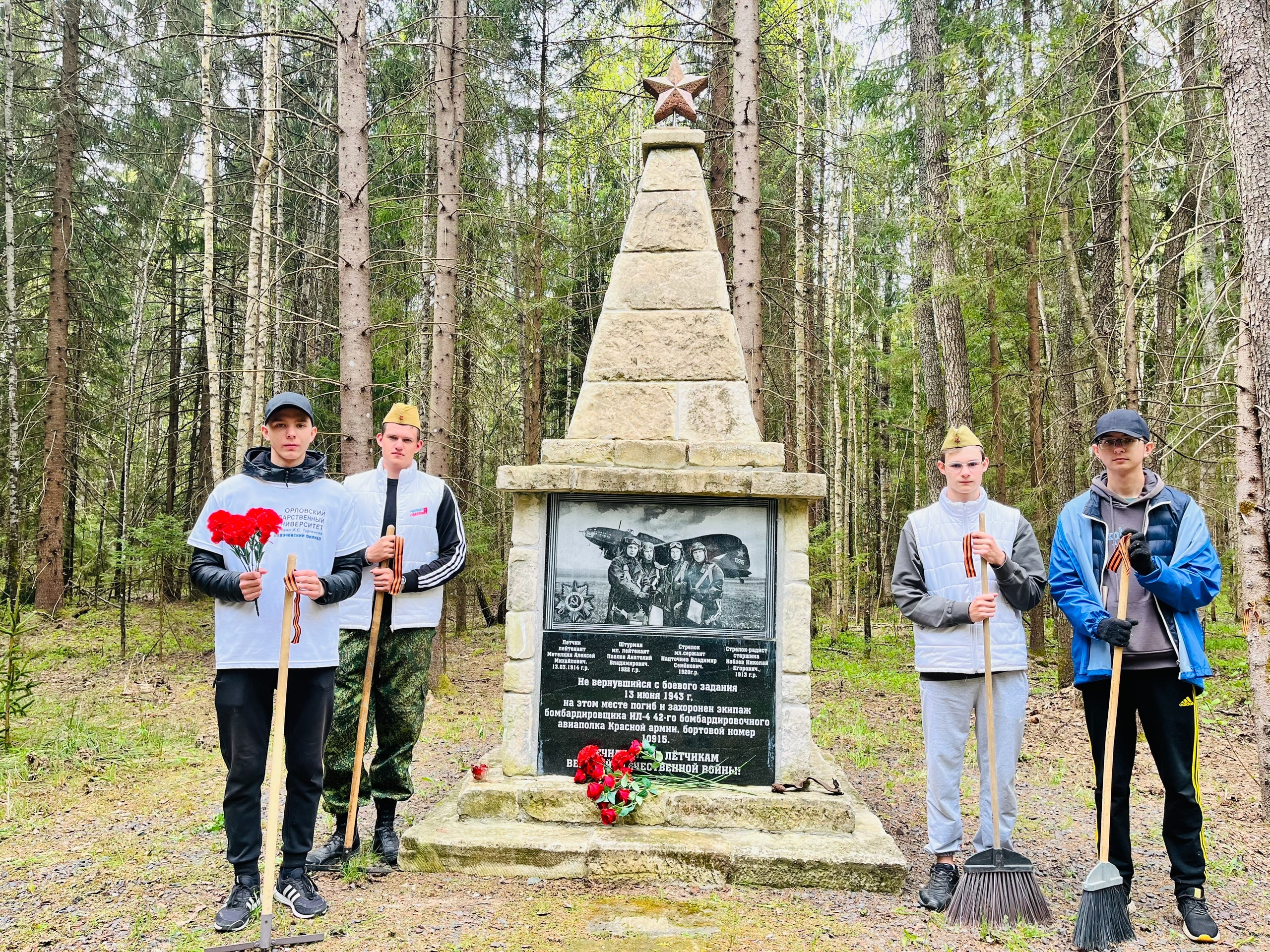 Студенты-волонтёры и молодогвардейцы КФ ОГУ имени И.С. Тургенева привели в порядок памятник экипажу бомбардировщика Ил-4, погибшему в 1943 году во время боёв за освобождение Брянщины. Мемориал расположен в лесном массиве неподалёку от реки Велимья в Карачевском районе.