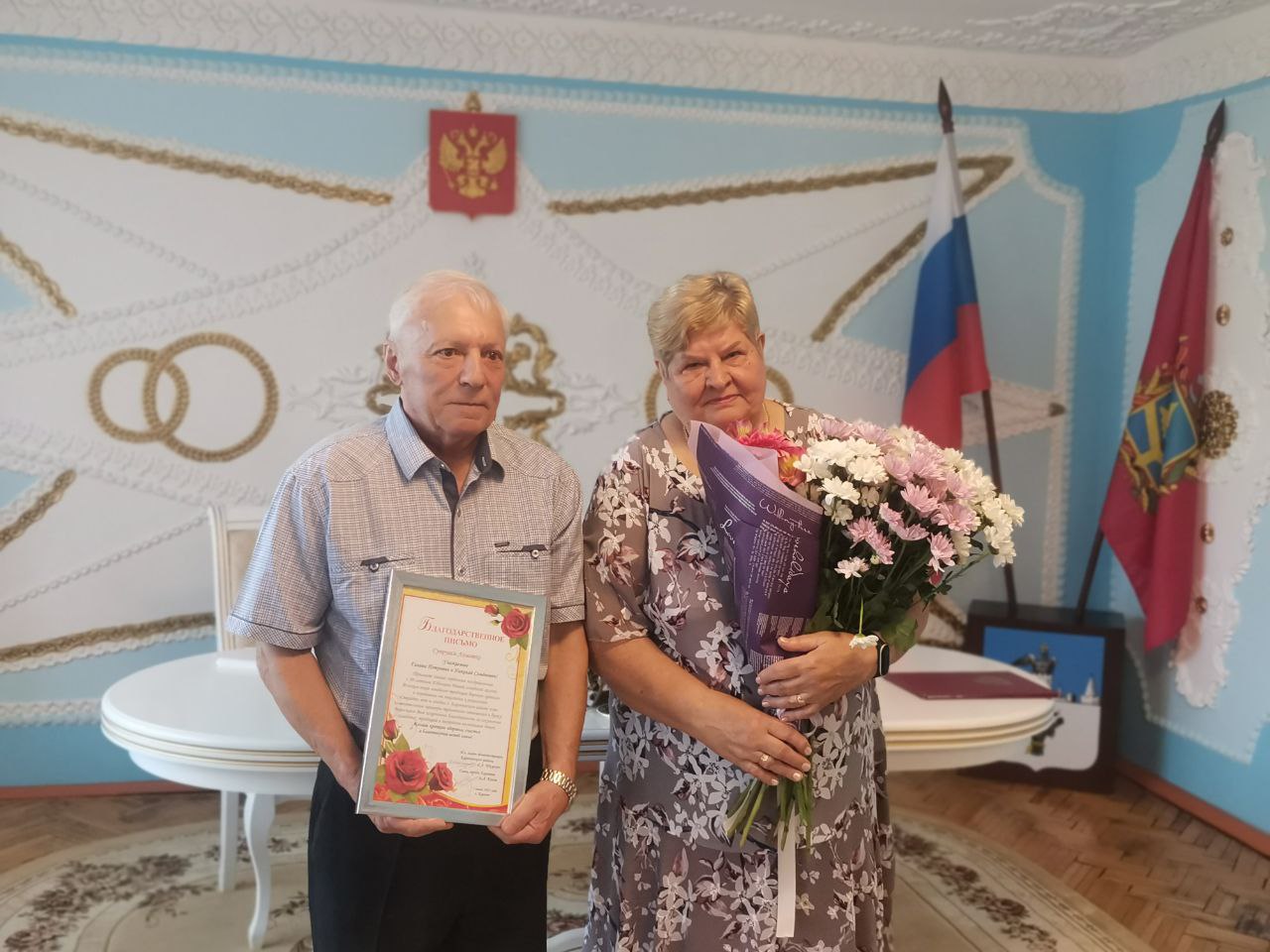 Начальник отдела ЗАГС Елена Антощенко поздравила пару, пожелав здоровья и семейного благополучия. Праздник посетили глава районной администрации Руслан Егоров, его заместителеь Елена Киселева и заместитель главы района Валентина Морозова, вручившие юбилярам Благодарственное письмо, цветы и памятные подарки.