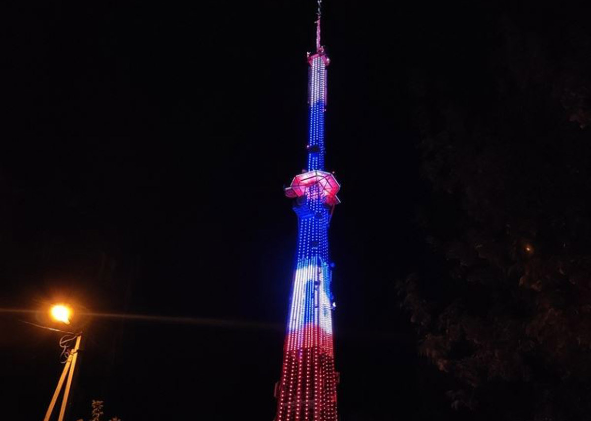 На медиафасаде Останкинской телебашни будет транслироваться поздравительный ролик в цветах триколора.