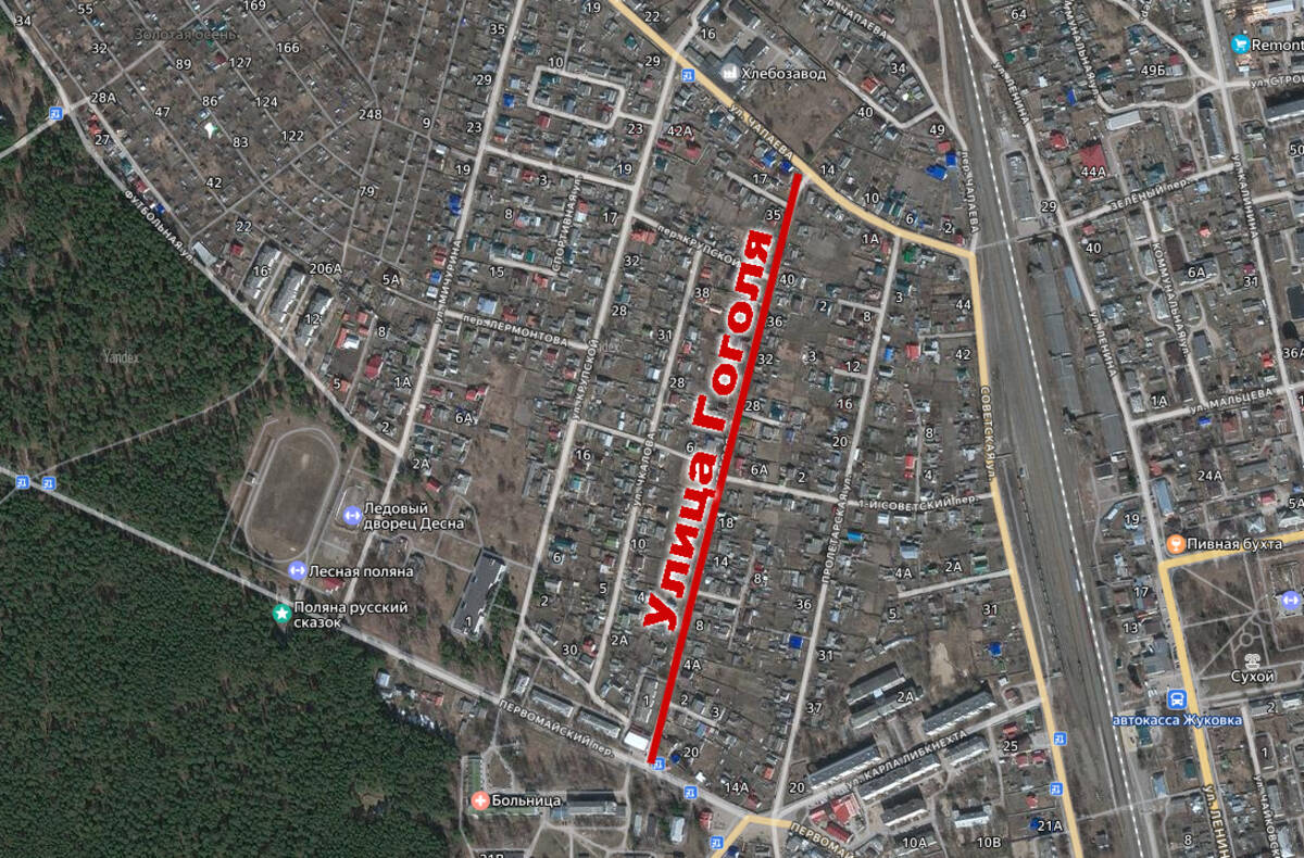 Улица Гоголя — ключевая дорога для жителей окраин, ведущая: к Жуковской межрайонной больнице, школе-интернату, хлебозаводу.