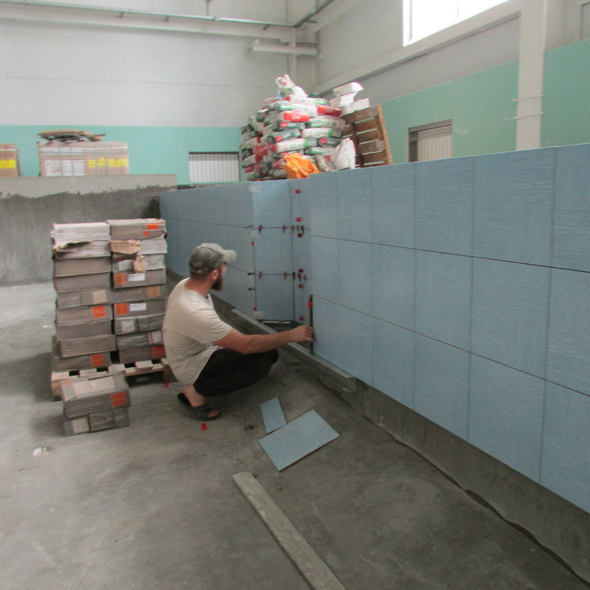 В административной части готовы коммуникации, выполнена чистовая отделка, началась уборка. В спортзале подготовили паркет к лакировке, в бассейне укладывают голубую плитку с белыми разделителями дорожек.