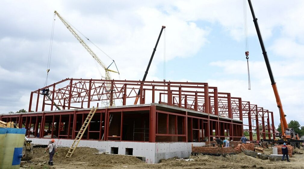В настоящее время ведётся монтаж металлического каркаса здания, установка колонн и панелей перекрытия, смонтирована котельная. Со следующей недели начнут устанавливать сэндвич-панели. В ближайшее время строители приступят к благоустройству территории.