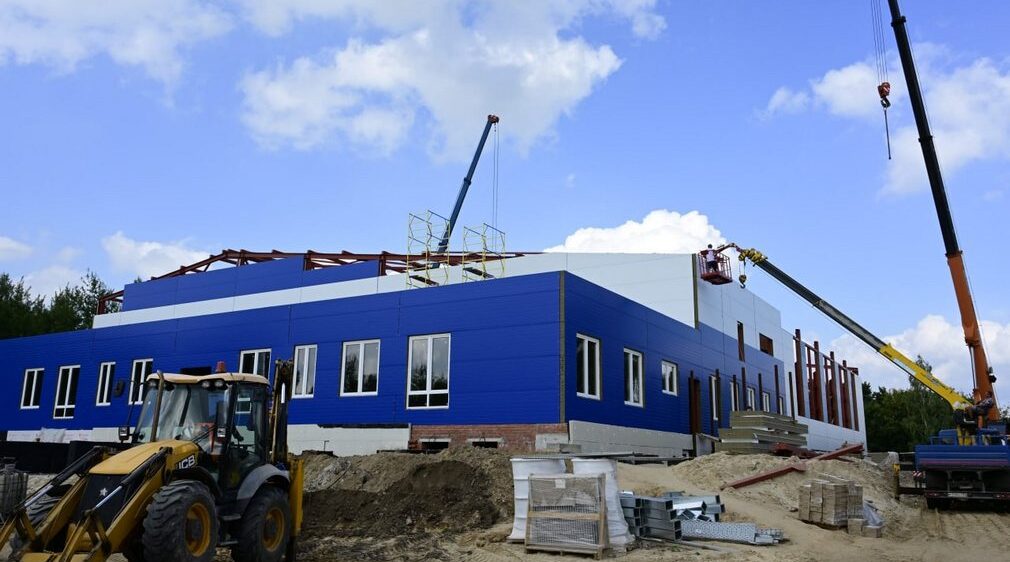 На текущий момент выполнены: установка металлических колонн, оштукатуривание перегородок в административной зоне и запуск котельной. Продолжается монтаж кровельных ферм, стеновых панелей и чаши бассейна. Отмечается отставание от графика, требующее увеличения числа рабочих на объекте.