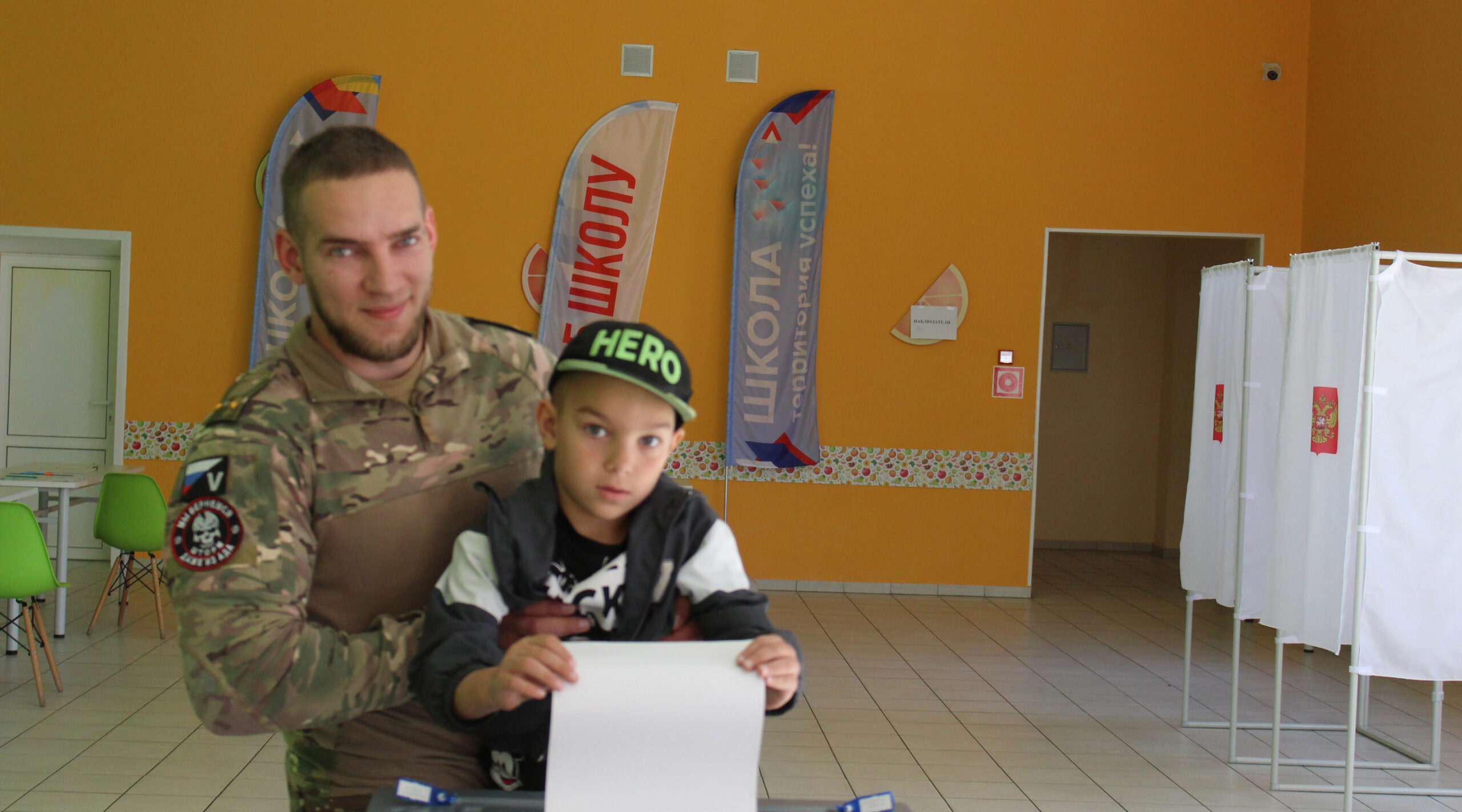 Участник специальной военной операции Евгений Савин принял участие в выборах, посетив избирательный участок вместе со своим маленьким сыном.