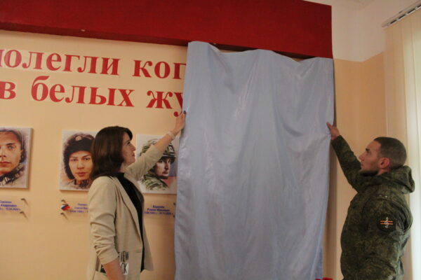 Право открыть памятные портреты было предоставлено директору филиала Ирине Мироновой и участнику СВО, лейтенанту, командиру штурмового взвода «Шторм-26» Евгению Савину.