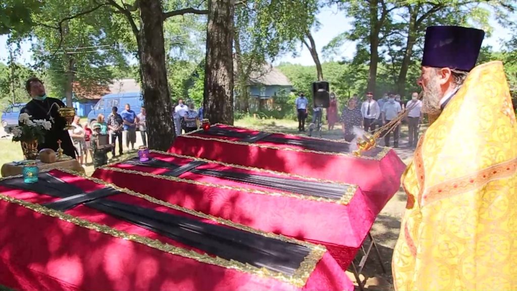 В честь воинов и мирных жителей, погибших в годы Великой Отечественной войны, была объявлена минута молчания. Протоиерей Владимир совершил чин заупокойной литии. Горсть земли от каждого из присутствующих на церемонии, а затем останки жителей обрели долгожданный покой.