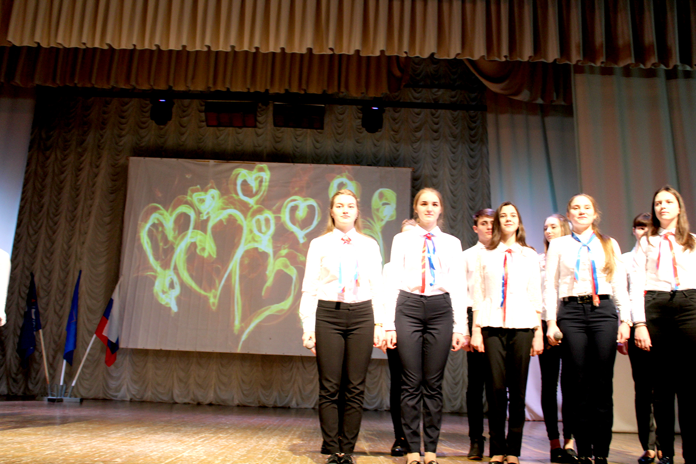 Мероприятие открылось Гимном России, затем прозвучал динамичный и жизнеутверждающий Гимн волонтеров в исполнении солистов РДК. Каждый отряд поднимался на сцену и рассказывал о своей работе, иллюстрируя рассказ видеоматериалами, которые проецировались на большом экране. Причем, спектр деятельности волонтеров достаточно широк и разнообразен – это общественно-социальное и патриотическое направления, пропаганда здорового образа жизни, решение экологических проблем и многое другое. Ребята рассказали, как они помогают одиноким пожилым людям, ветеранам Великой Отечественной войны, ухаживают за памятниками и обелисками, благоустраивают территории, не только убирая мусор, но и высаживая деревья. А девиз «Больше дела — меньше слов» стал ярким подтверждением тому, как на полученные от сдачи макулатуры деньги ребята приобрели памперсы и передали их в Карачевский Дом ребенка. Да и проводимые ими акции говорят сами за себя: «Открытка ветерану», «Обелиск», « Бабушкина улыбка», «Зеленый наряд России», «Георгиевская ленточка» и т.д.