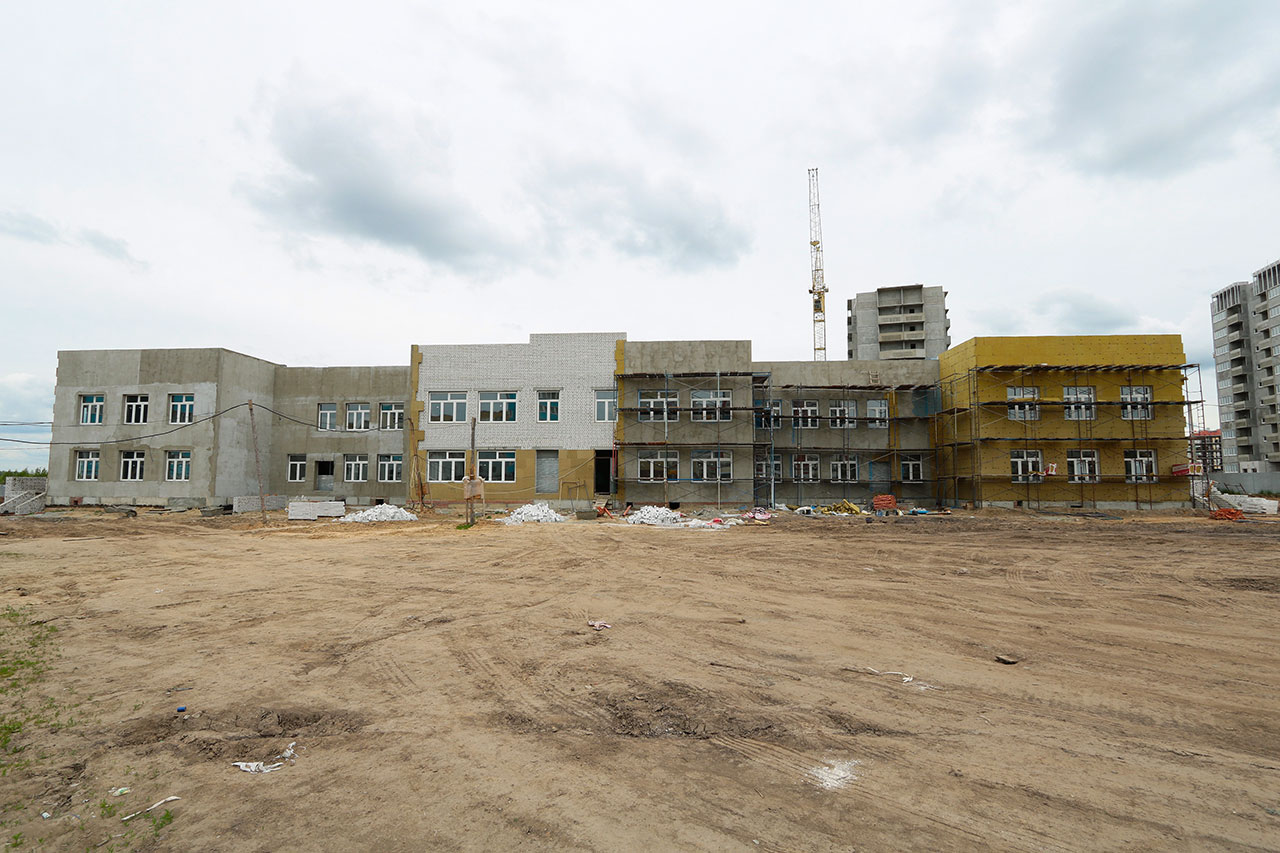 Сейчас здесь сделана вертикальная планировка двора, построена коробка здания. Подтянули все наружные коммуникации, разводят по этажам инженерные сети. Параллельно проводят штукатурные работы.