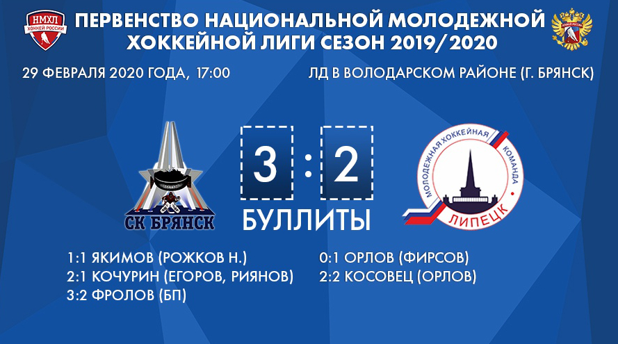 Наарене ледового дворца в Володарском районе Брянска вчера прошла игра. В рамках первенства национальной молодежной хоккейной лиги брянская команда померилась силами с гостями из Липецка. В итоге брянцы победили со счетом 3:2.