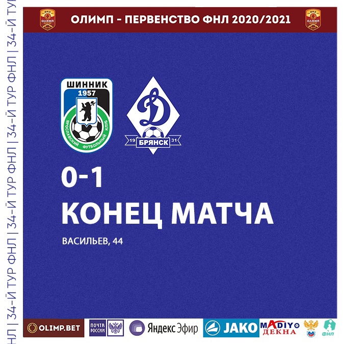 Завершился матч 34 тура Олимп-Первенства ФНЛ сезона 2020/2021, который прошел в Ярославле. «Динамо — Брянск» сражалось за шесть очков с ярославским «Шинником».