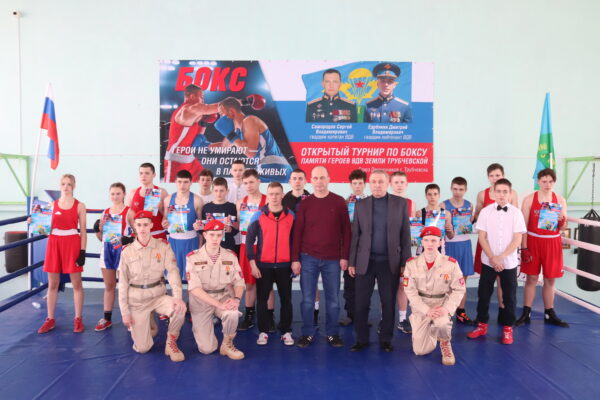 На стене у боксерского ринга расположен плакат с портретами земляков-десантников: гвардии капитана ВДВ Сергея Самородова и гвардии лейтенанта ВДВ Дмитрия Едренкина, героически погибших в СВО при исполнении воинского долга.