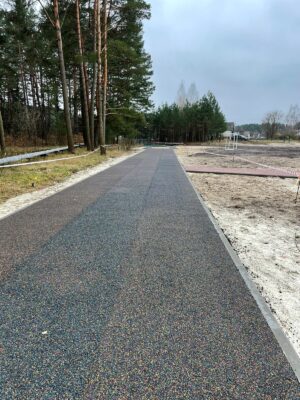 Работы близятся к завершению. Рабочие уложили специальное покрытие на беговую дорожку. Оборудована зона для прыжков в длину, установлены ворота на футбольном поле. На будущем стадионе также планируется разместить баскетбольную площадку и тренировочную зону.