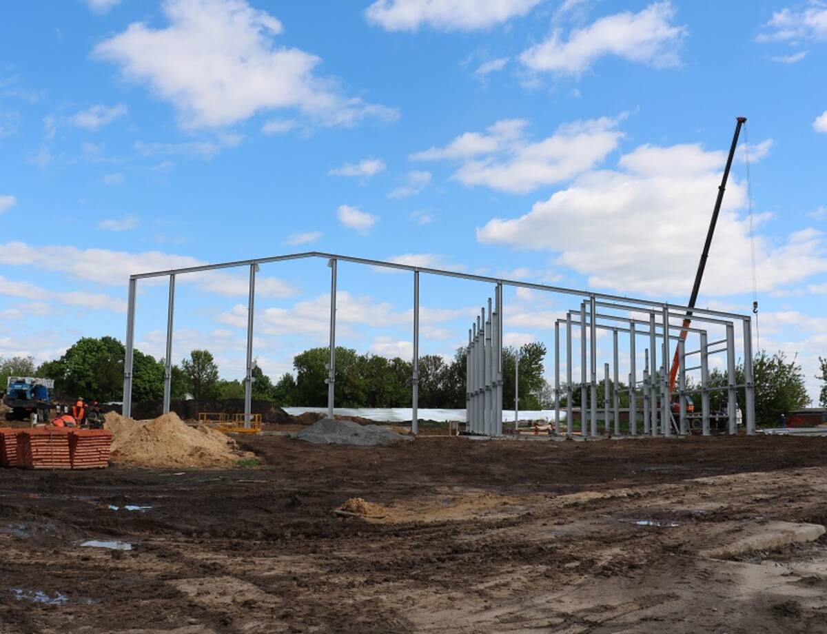 Одновременно идёт монтаж металлоконструкций, кладка кирпичных перегородок в подвальных помещениях. Плодородный слой земли, снятый при выкопке котлована, будет использован в работе по благоустройству.