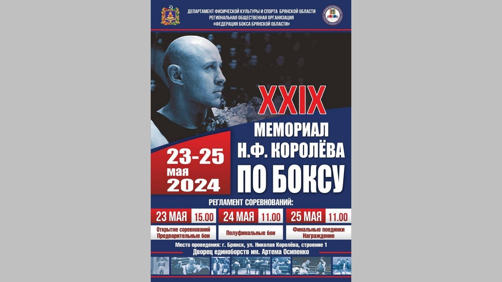 В Брянске во Дворце единоборств имени Артема Осипенко с 23 по 25 мая будет проходить 29-й Мемориал имени Николая Королева по боксу. Об этом сообщает РИА «Стрела».